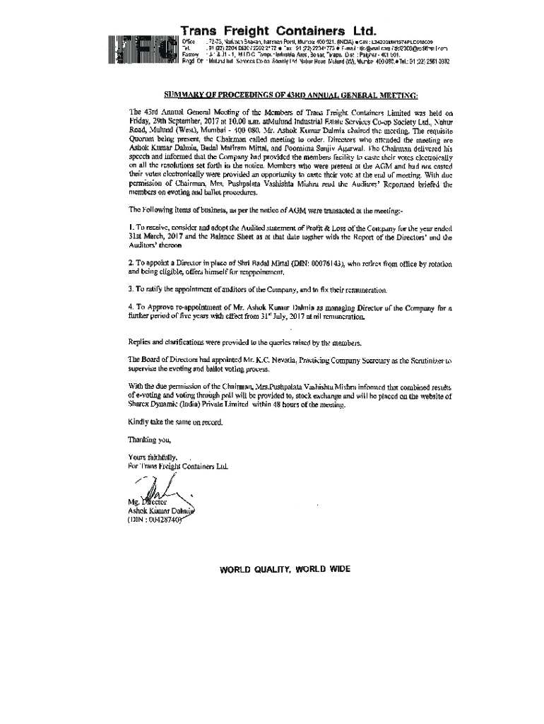 TRANS FREIGHT CONTAINERS LIMITED43rd Annual Report 2016 2017TRANS FREIGHT CONTAINERS LTD. BOARD OF DIRECTORS Sari Ashok Kumar Alma Sari Basal Mitral Sari Anil Mitral Mrs. Porrima S. AgarwalManaging