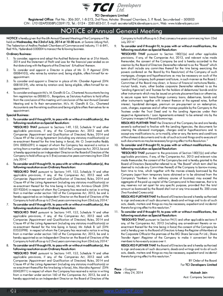 TCI Developers Limited Registered Office: Flat No.: 306307, 18273, 3rd Floor, Ashoka Bhopal Chambers, S. P. Road, Secunderbad 500003 IN : L70102AP2008PLC059173, Tel.: 0124 238160307, Email: secretarial@tcidevelopers.com,