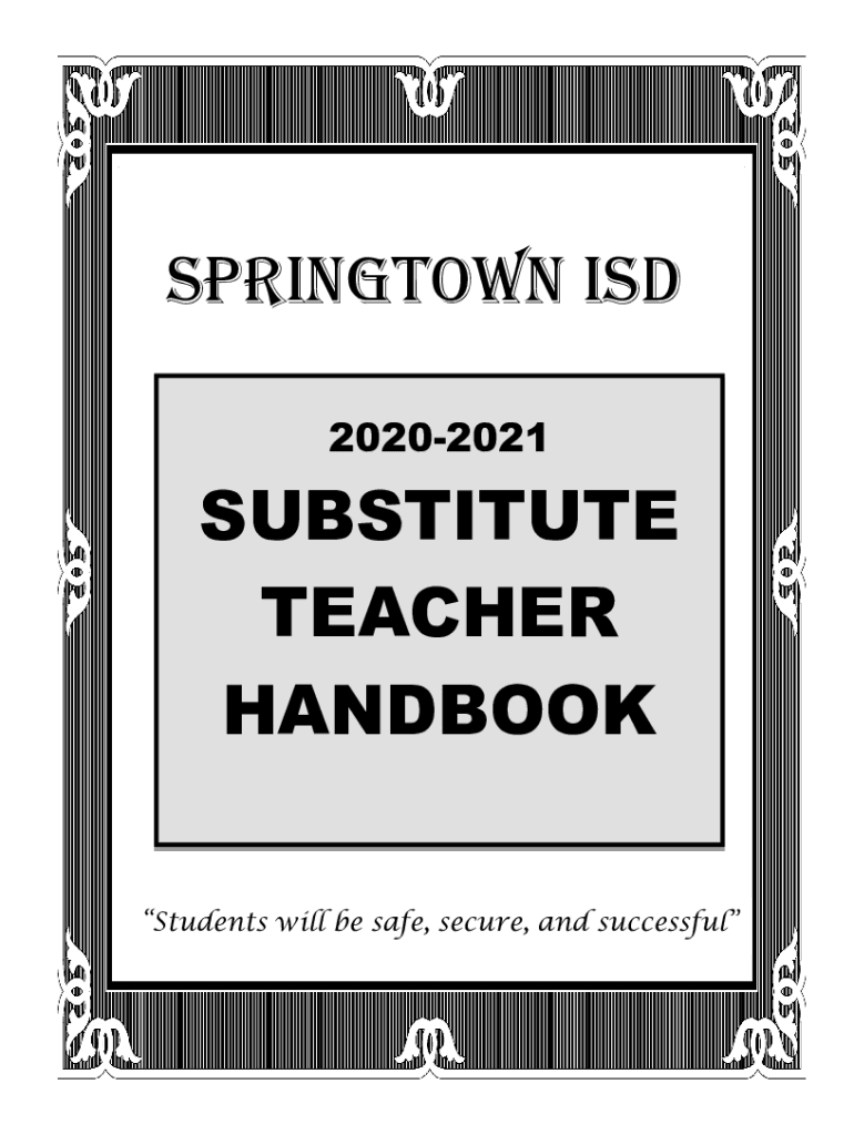 SPRINGSTEEN ISD 20202021SUBSTITUTE TEACHER HANDBOOK Students will be safe, secure, and successfulTABLE OF CONTENTS INTRODUCTION.....3 Board of Trustees .........................................................................................................................................