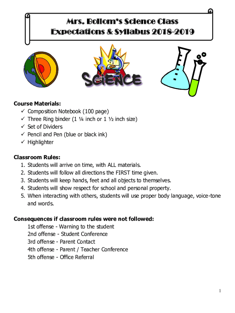 Mrs. Boll oms Science Class Expectations & Syllabus 20182019Course Materials: Composition Notebook (100 page) Three Ring binder (1 inch or 1 inch size) Set of Dividers Pencil and Pen (blue or black
