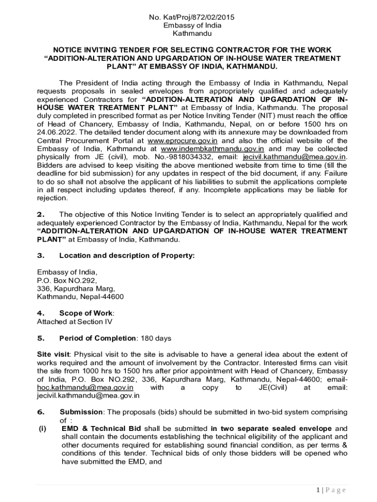 No. Kat/Pro/872/02/2015 Embassy of India Kathmandu NOTICE INVITING TENDER FOR SELECTING CONTRACTOR FOR THE WORK ADDITIONALTERATION AND RETARDATION OF HOUSE WATER TREATMENT PLANT AT EMBASSY OF INDIA,