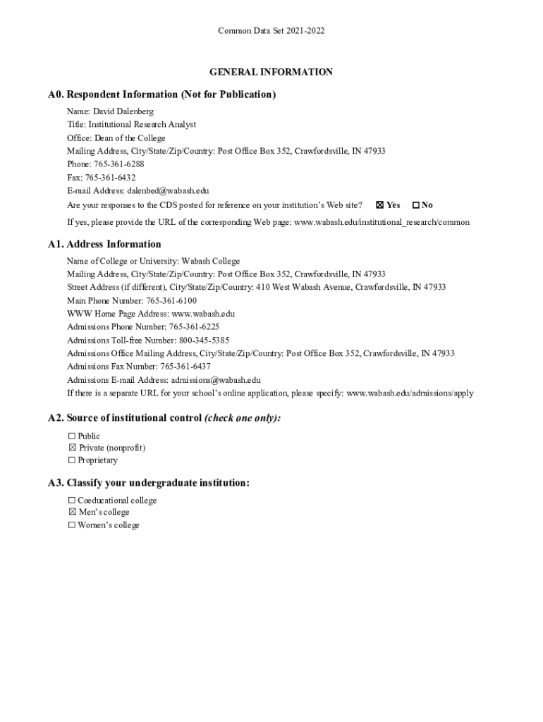 Common Data Set 20212022GENERAL INFORMATIONA0. Respondent Information (Not for Publication)