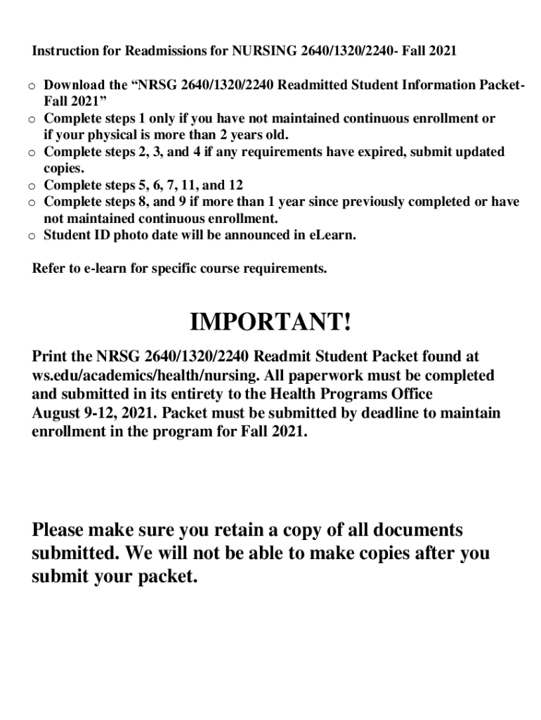 Instruction for Readmissions for NURSING 2640/1320/2240 Fall 2021 o Download the NRG 2640/1320/2240 Readmitted Student Information Basketball 2021 o Complete steps 1 only if you have not maintained
