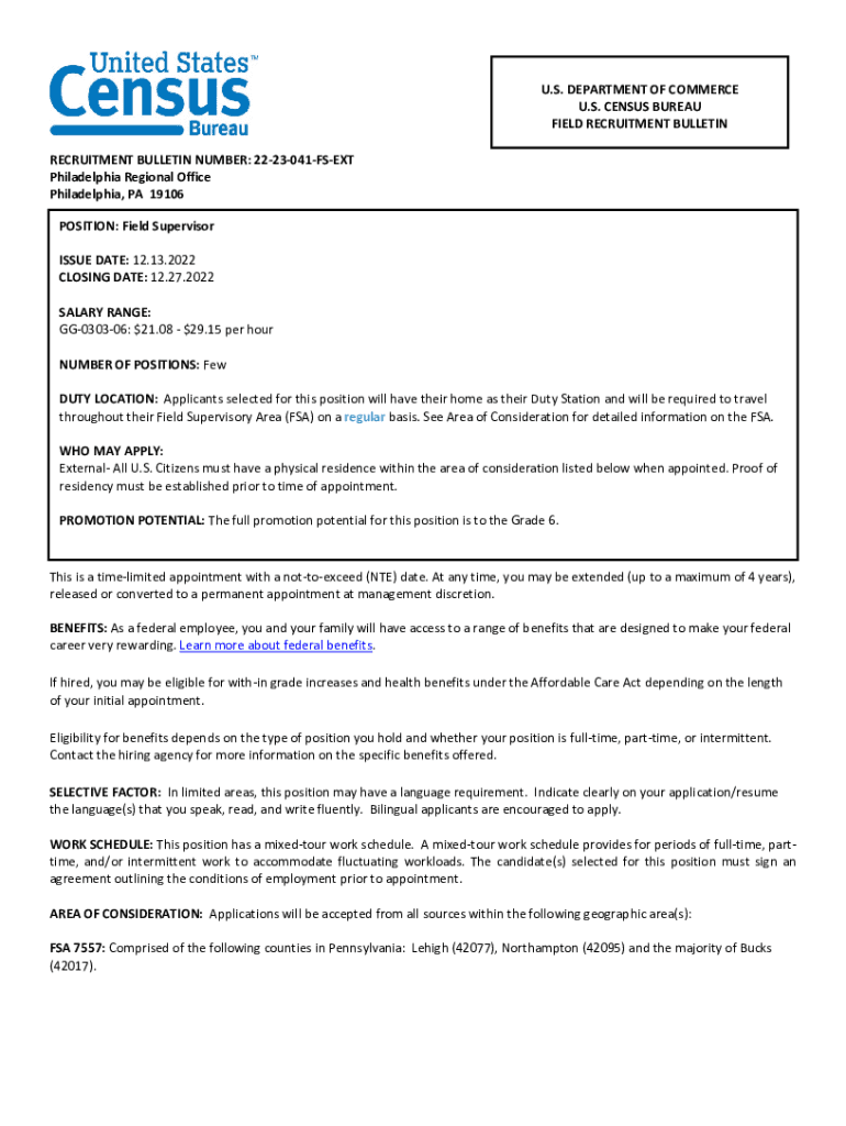U.S. DEPARTMENT OF COMMERCE U.S. CENSUS BUREAU FIELD RECRUITMENT BULLETIN NUMBER: 2223041FSEXT Philadelphia Regional Office Philadelphia, PA 19106 POSITION: Field Supervisor ISSUE DATE: 12.13.2022