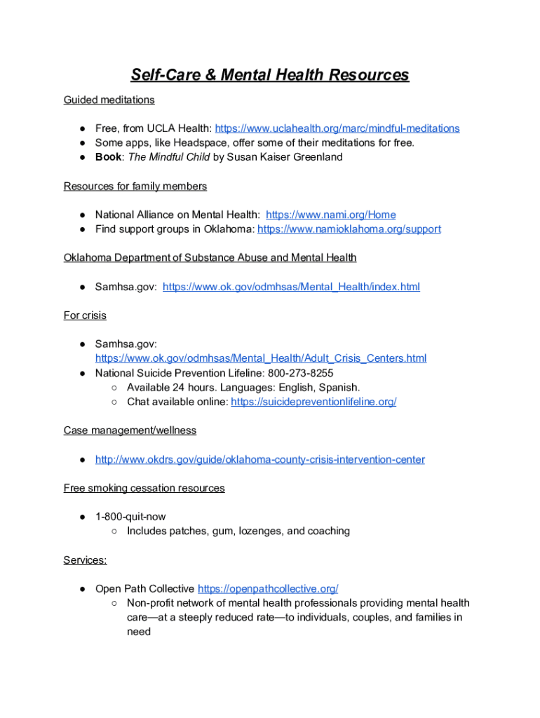 Welfare & Mental Health Resources Guided meditations Free, from UCLA Health: https://www.uclahealth.org/marc/mindfulmeditations Some apps, like Headspace, offer some of their meditations for free.