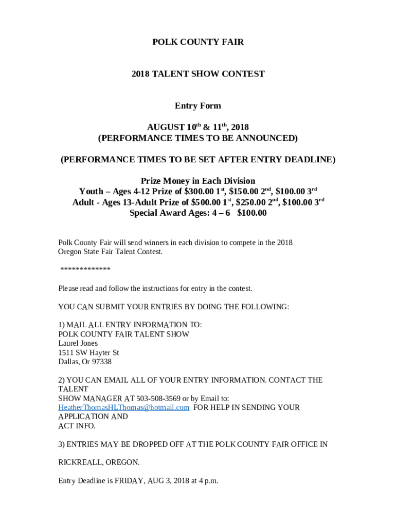 Instructions for the Polk County Fair 2018 Talent Show Contest Entry form