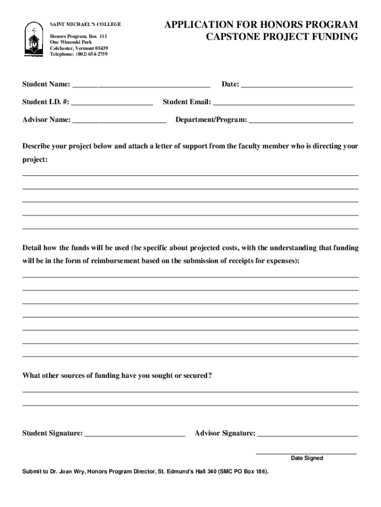 SAINT MICHAEL COLLEGE Honors Program, Box 111 One Sinews Park Colchester, Vermont 05439 Telephone: (802) 6542759APPLICATION FOR HONORS PROGRAM CAPSTONE PROJECT FUNDINGStudent Name: ___ Student I.D.