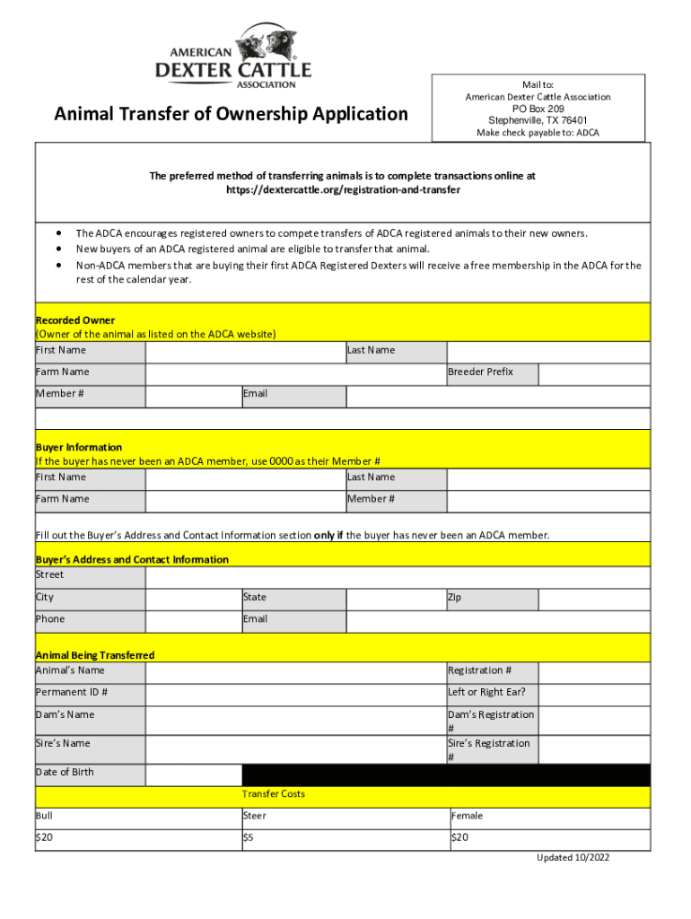 Mail to: American Dexter Cattle AssociationAnimal Transfer of Ownership Application PO Box 209 Steubenville, TX 76401Make check payable to: Agathe preferred method of transferring animals is to complete