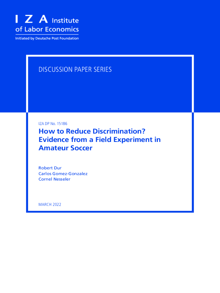 DISCUSSION PAPER SERIES DP No. 15186How to Reduce Discrimination? Evidence from a Field Experiment in Amateur Soccer Robert Due Carlos Gomez Gonzalez Corner NesselerMARCH 2022DISCUSSION PAPER SERIES