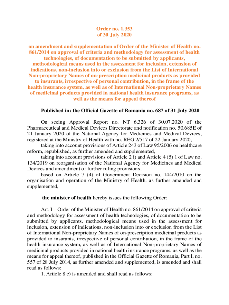Order no. 1.353 of 30 July 2020 on amendment and supplementation of Order of the Minister of Health no. 861/2014 on approval of criteria and methodology for assessment of health technologies, of documentation