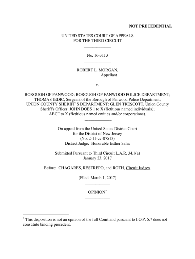 NOT PRESIDENTIAL UNITED STATES COURT OF APPEALS FOR THE THIRD CIRCUIT ___ No. 163113 ___ ROBERT L. MORGAN, Appellant v. BOROUGH OF MANHOOD; BOROUGH OF MANHOOD POLICE DEPARTMENT; THOMAS JEDI, Sergeant