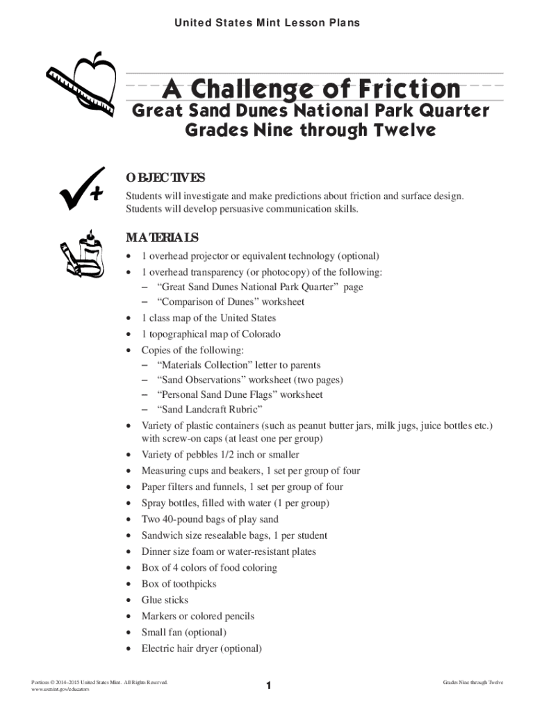 United States Mint Lesson Plans Challenge of FrictionGreat Sand Dunes National Park Quarter Grades Nine through Twelve OBJECTIVES Students will investigate and make predictions about friction and