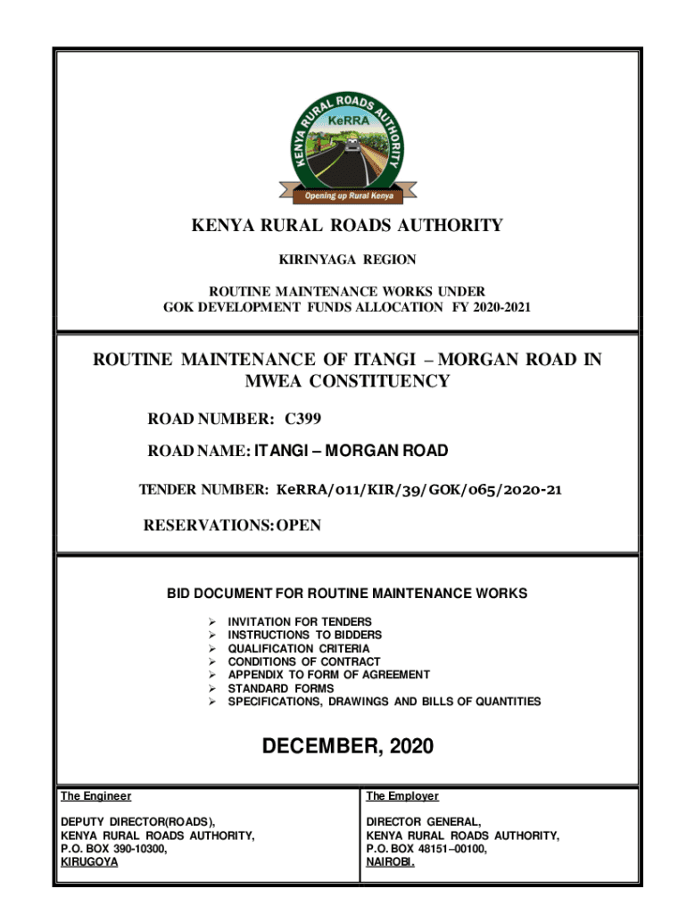 KENYA RURAL ROADS AUTHORITY KIRINYAGA REGION ROUTINE MAINTENANCE WORKS Undergo DEVELOPMENT FUNDS ALLOCATION FY 20202021ROUTINE MAINTENANCE OF TANGO MORGAN ROAD IN MEA CONSTITUENCY ROAD NUMBER: C399