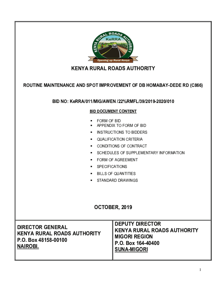 KENYA RURAL ROADS AUTHORITY ROUTINE MAINTENANCE AND SPOT IMPROVEMENT OF DB HOMABAYDEDE RD (C866) BID NO: Kerry/011/MIG/OWEN /22%RMFL/39/20192020/010 BID DOCUMENT CONTENT FORM OF BID APPENDIX TO FORM
