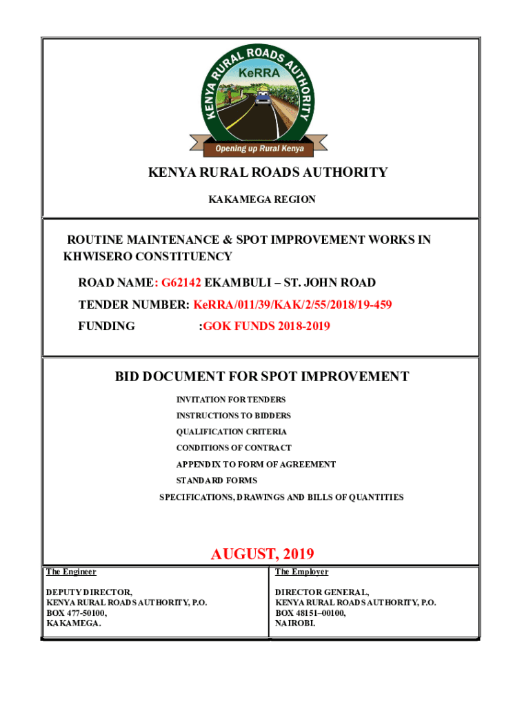 KENYA RURAL ROADS AUTHORITY ALAMEDA REGIONROUTINE MAINTENANCE & SPOT IMPROVEMENT WORKS IN KAISER CONSTITUENCY ROAD NAME: G62142 KABUL ST. JOHN ROAD TENDER NUMBER: Kerry/011/39/OAK/2/55/2018/19459