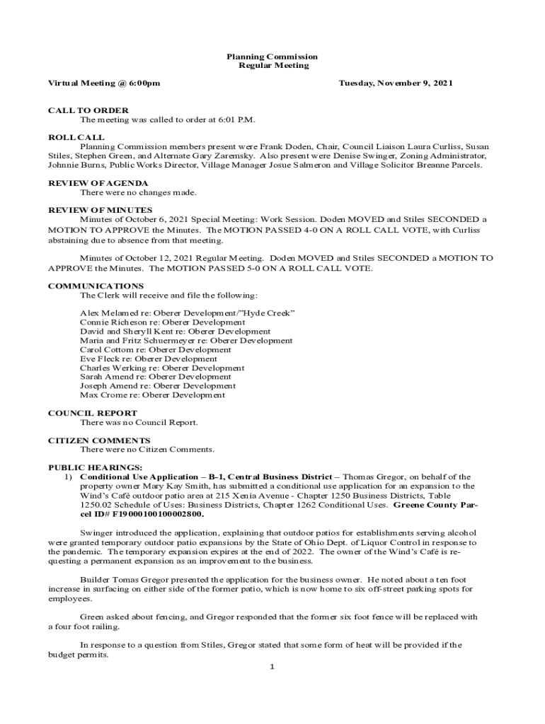 Planning Commission Regular Meeting Virtual Meeting @ 6:00pmTuesday, November 9, 2021CALL TO ORDER The meeting was called to order at 6:01 P.M. ROLL CALL Planning Commission members present were Frank