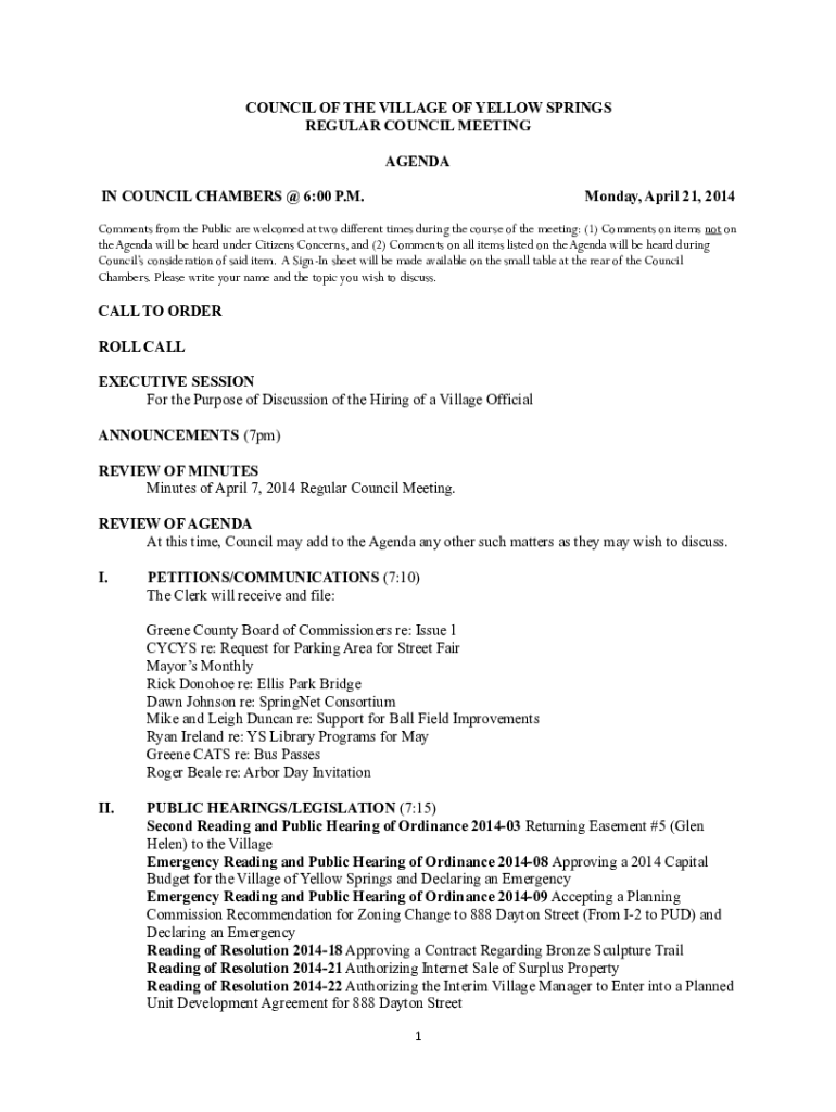 COUNCIL OF THE VILLAGE OF YELLOW SPRINGS REGULAR COUNCIL MEETING AGENDA IN COUNCIL CHAMBERS @ 6:00 P.M.Monday, April 21, 2014Comments from the Public are welcomed at two different times during the