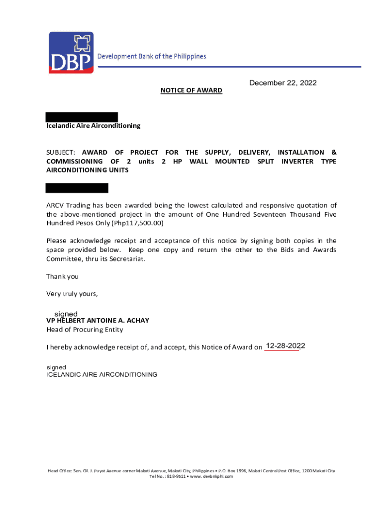 NOTICE OF AWARD December 22, 2022Icelandic Are Air conditioning SUBJECT: AWARD OF PROJECT FOR THE SUPPLY, DELIVERY, INSTALLATION & COMMISSIONING OF 2 units 2 HP WALL MOUNTED SPLIT INVERTER TYPE AIR-CONDITIONING