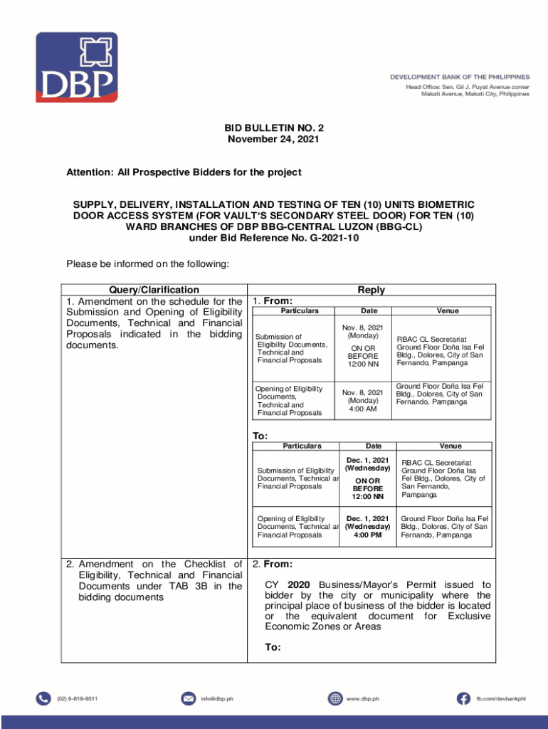 BID BULLETIN NO. 2 November 24, 2021Attention: All Prospective Bidders for the projectSUPPLY, DELIVERY, INSTALLATION AND TESTING OF TEN (10) UNITS BIOMETRIC DOOR ACCESS SYSTEM (FOR VAULTS SECONDARY