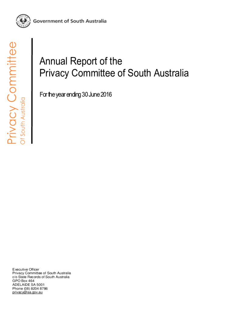 Of South AustraliaPrivacy CommitteeAnnual Report of the Privacy Committee of South Australia For the year ending 30 June 2016Executive Officer Privacy Committee of South Australia c/o State Records
