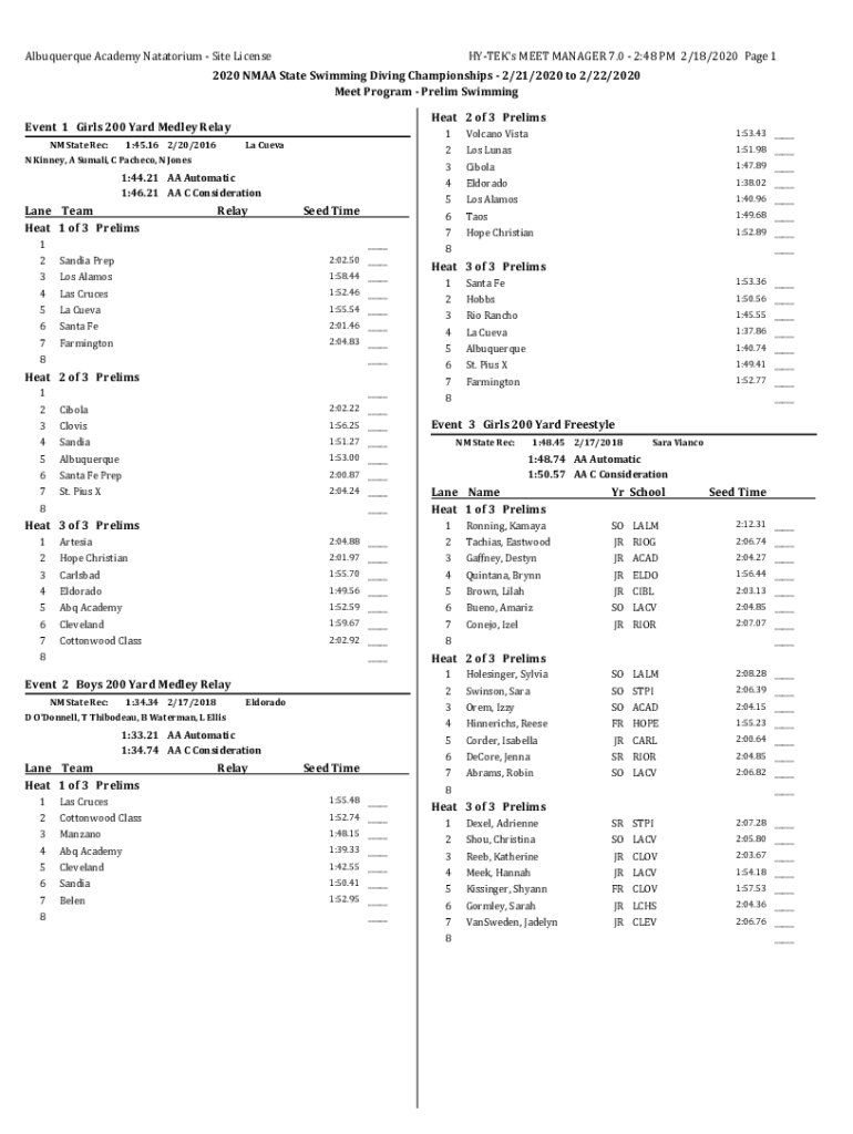 Albuquerque Academy Sanatorium Site LicenseHYTEK\'s MEET MANAGER 7.0 2:48 PM 2/18/2020-Page 12020 NCAA State Swimming Diving Championships 2/21/2020 to 2/22/2020 Meet Program Prelim Swimming Heat