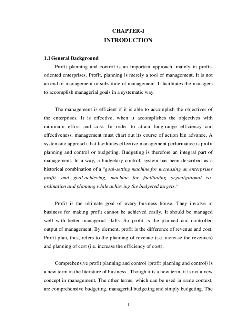 CHAPTERIINTRODUCTION 1.1 General Background Profit planning and control is an important approach, mainly in profit oriented enterprises. Profit, planning is merely a tool of management. It is not