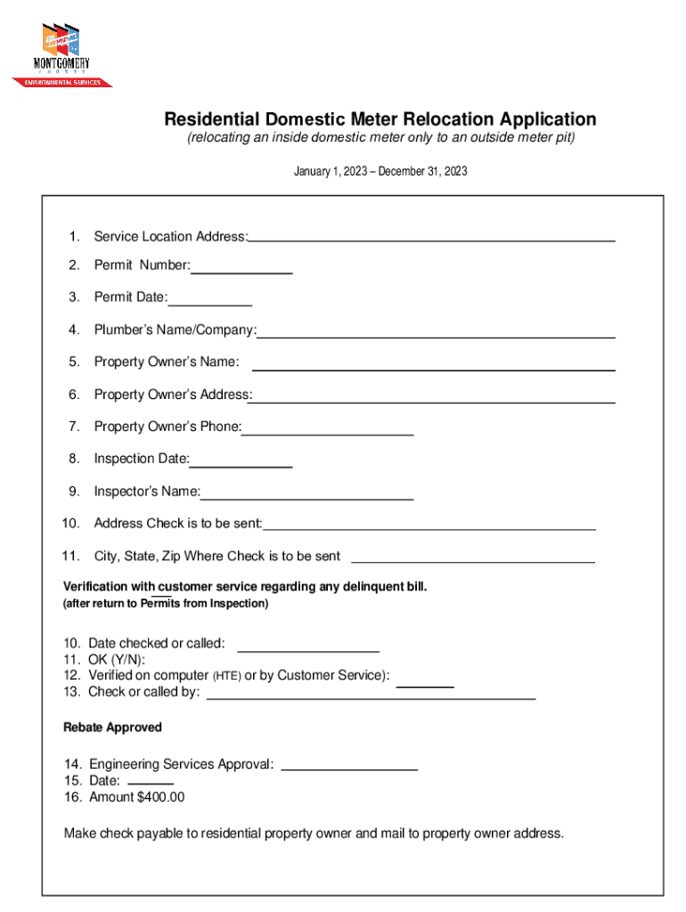 Residential Domestic Meter Relocation Application (relocating an inside domestic meter only to an outside meter pit) January 1, 2023, December 31, 20231. Service Location Address:2. Permit Number:3.