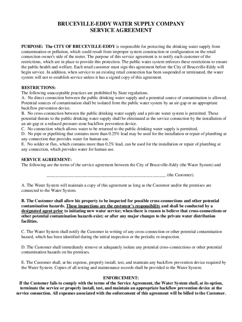BRUCEVILLEEDDY WATER SUPPLY COMPANY SERVICE AGREEMENT PURPOSE: The CITY OF BRUCEVILLEEDDY is responsible for protecting the drinking water supply from contamination or pollution, which could result