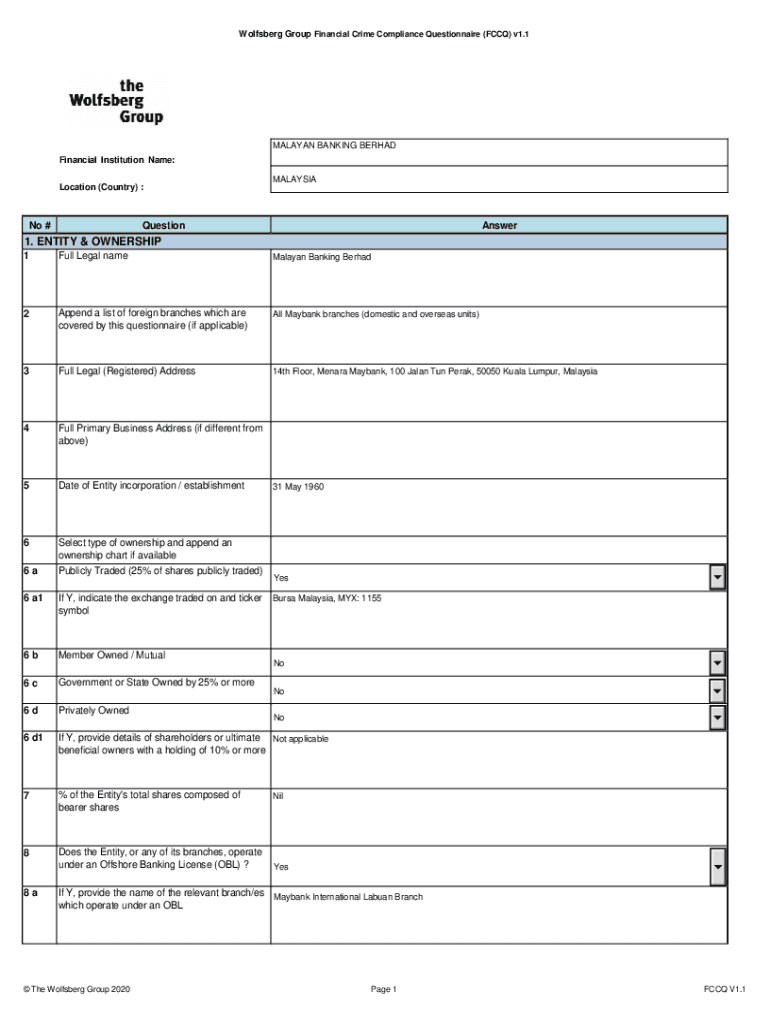 Wolves berg Group Financial Crime Compliance Questionnaire (FCC) v1.1MALAYAN BANKING BERHADFinancial Institution Name: Location (Country) :No #MALAYSIAQuestionAnswer1. ENTITY & OWNERSHIP 1Full Legal