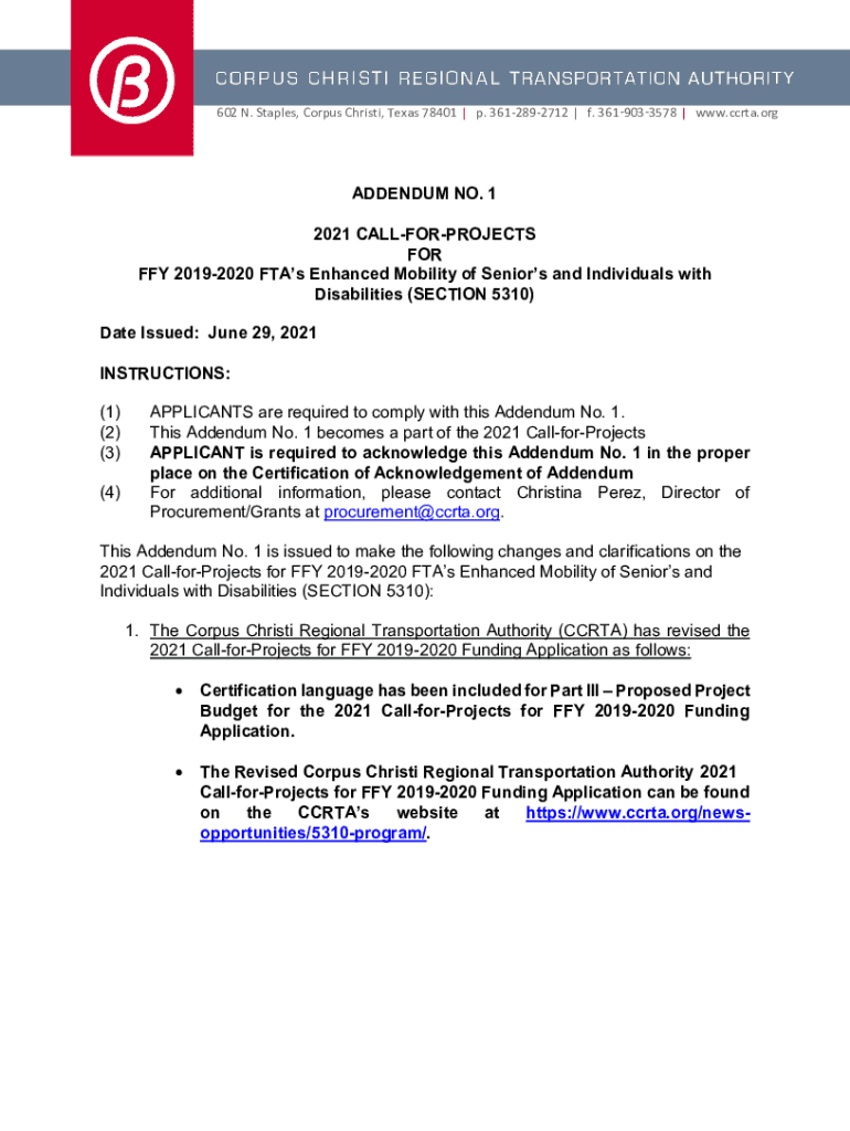 602 N. Staples, Corpus Christi, Texas 78401 | p. 3612892712 | f. 3619033578 | www.ccrta.orgADDENDUM NO. 1 2021 CALLFORPROJECTS FOR FLY 20192020 FTA Enhanced Mobility of Seniors and Individuals with