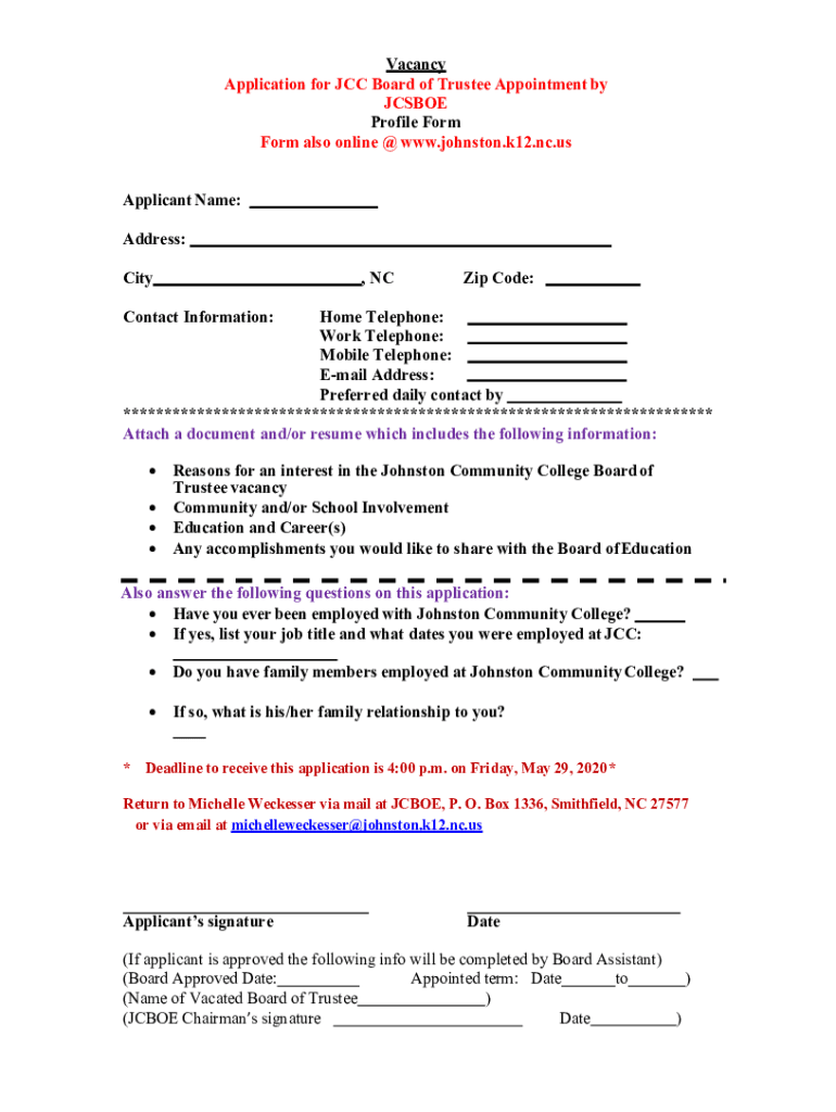 Vacancy Application for JCC Board of Trustee Appointment by JCS BOE Profile Form also online @ www.johnston.k12.nc.us Applicant Name: Address: City, Nazi Code:Contact Information:Home Telephone: Work