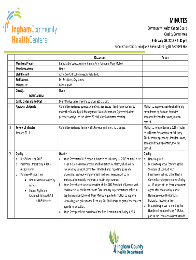 MINUTES Community Health Center Board Quality Committee February 20, 2019 5:30 pm Zoom Connection: (646) 5588656; Meeting ID: 582 089 366 Discussion Members Present Members Absent Staff Present Staff