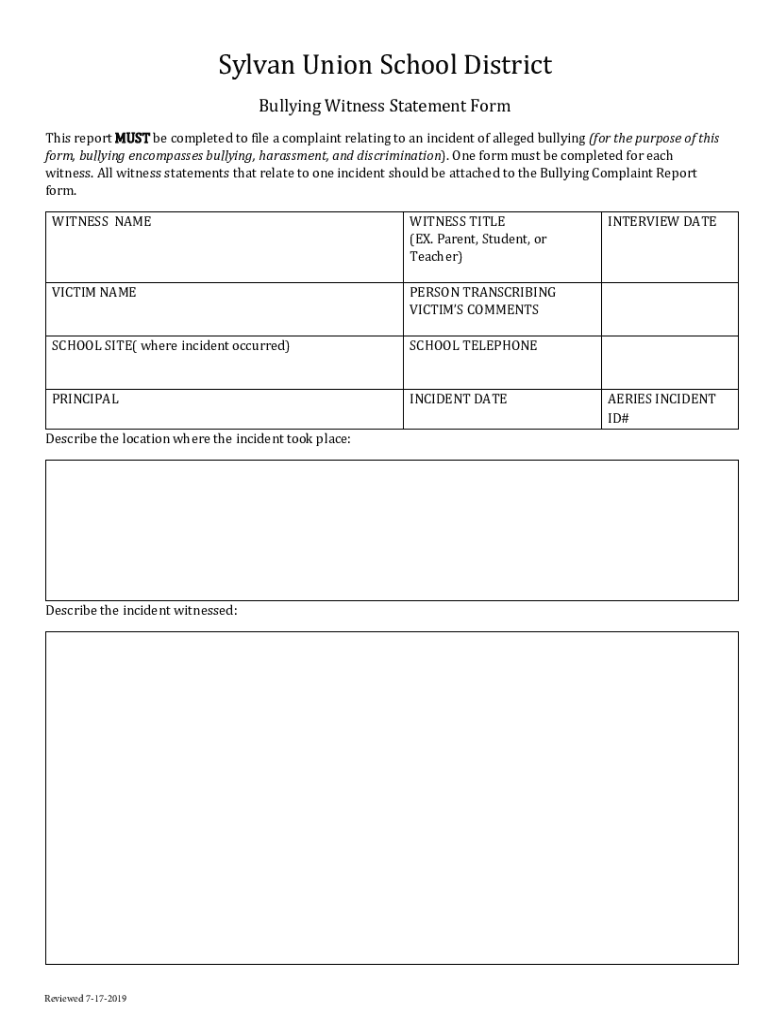 Sylvan Union School District Bullying Witness Statement Forms report MUST be completed to file a complaint relating to an incident of alleged bullying (for the purpose of this form, bullying encompasses