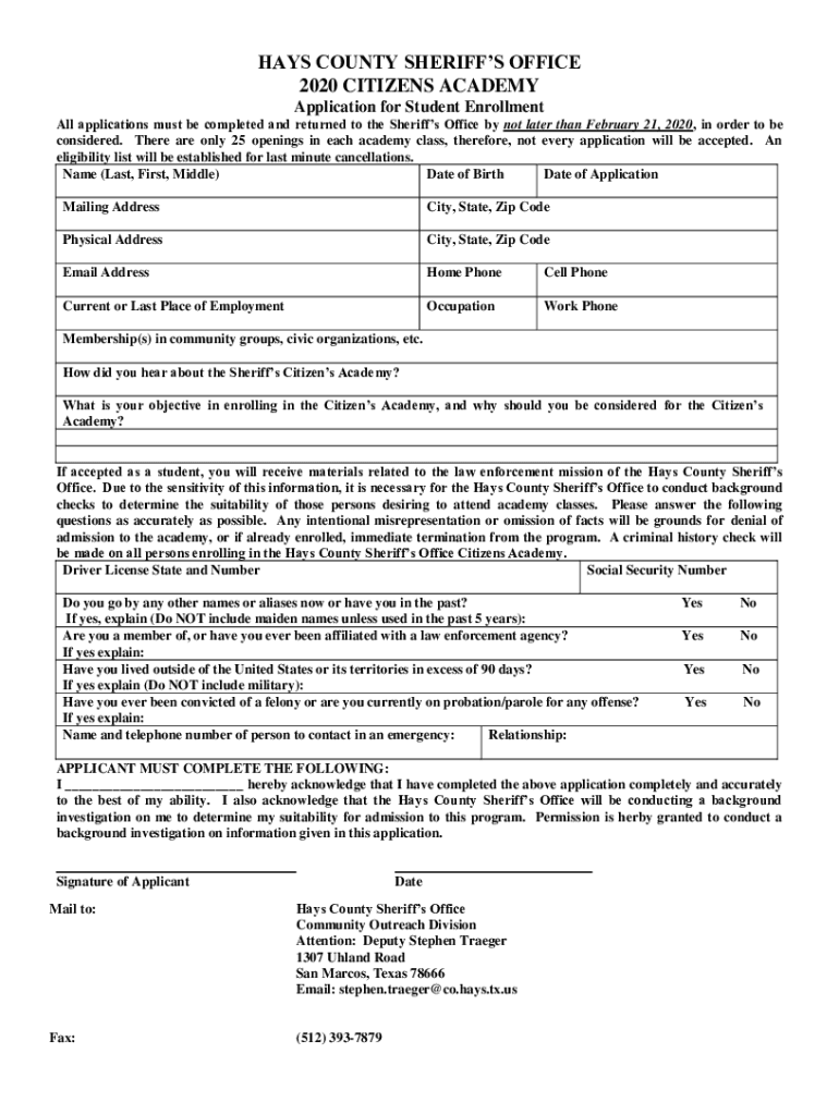 All applications must be completed and returned to the Sheriffs Office by not later than February 21, 2020, in