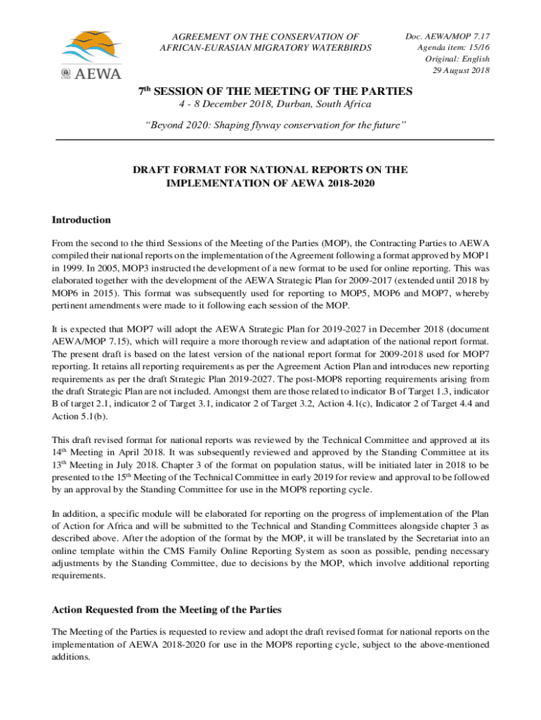 AGREEMENT ON THE CONSERVATION OF AFRICANEURASIAN MIGRATORY Waterbirds. AEA/MOP 7.17 Agenda item: 15/16 Original: English 29 August 20187th SESSION OF THE MEETING OF THE PARTIES 4 8 December 2018,