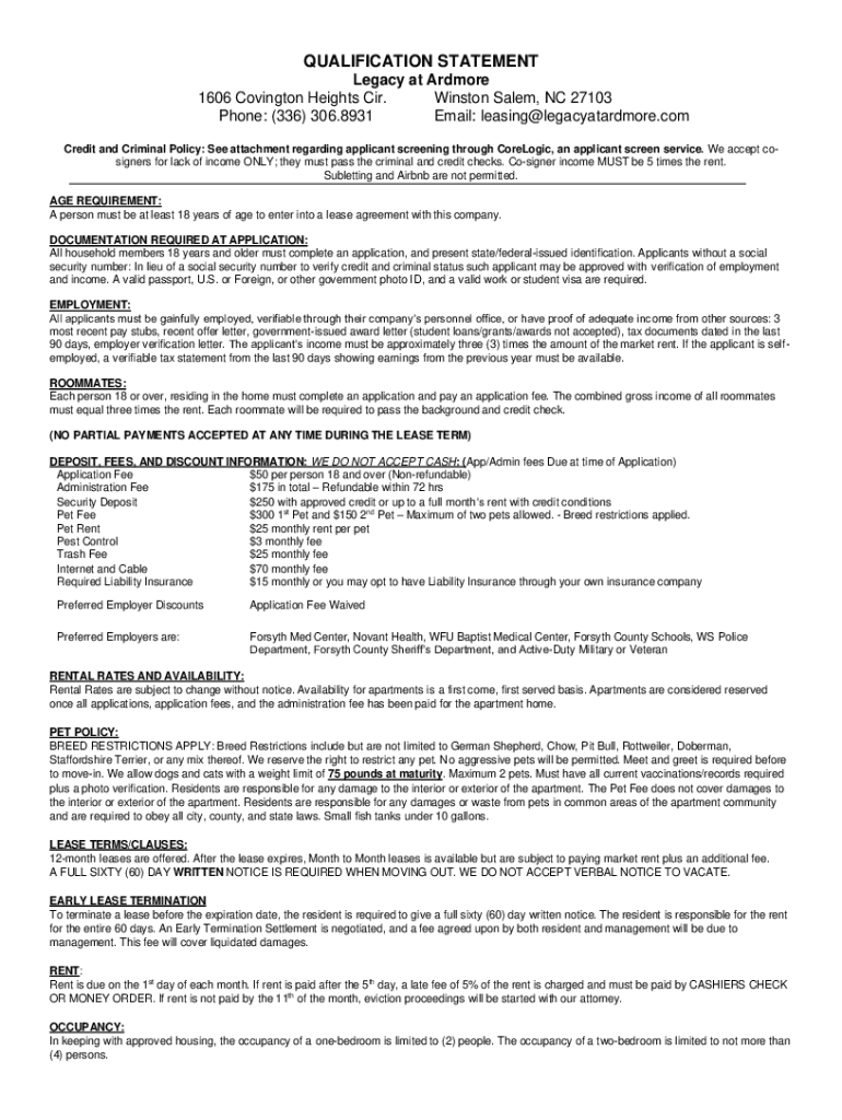 QUALIFICATION STATEMENT Legacy at Ardmore 1606 Covington Heights Cir. Winston-Salem, NC 27103 Phone: (336) 306.8931 Email: leasing@legacyatardmore.com Credit and Criminal Policy: See attachment regarding