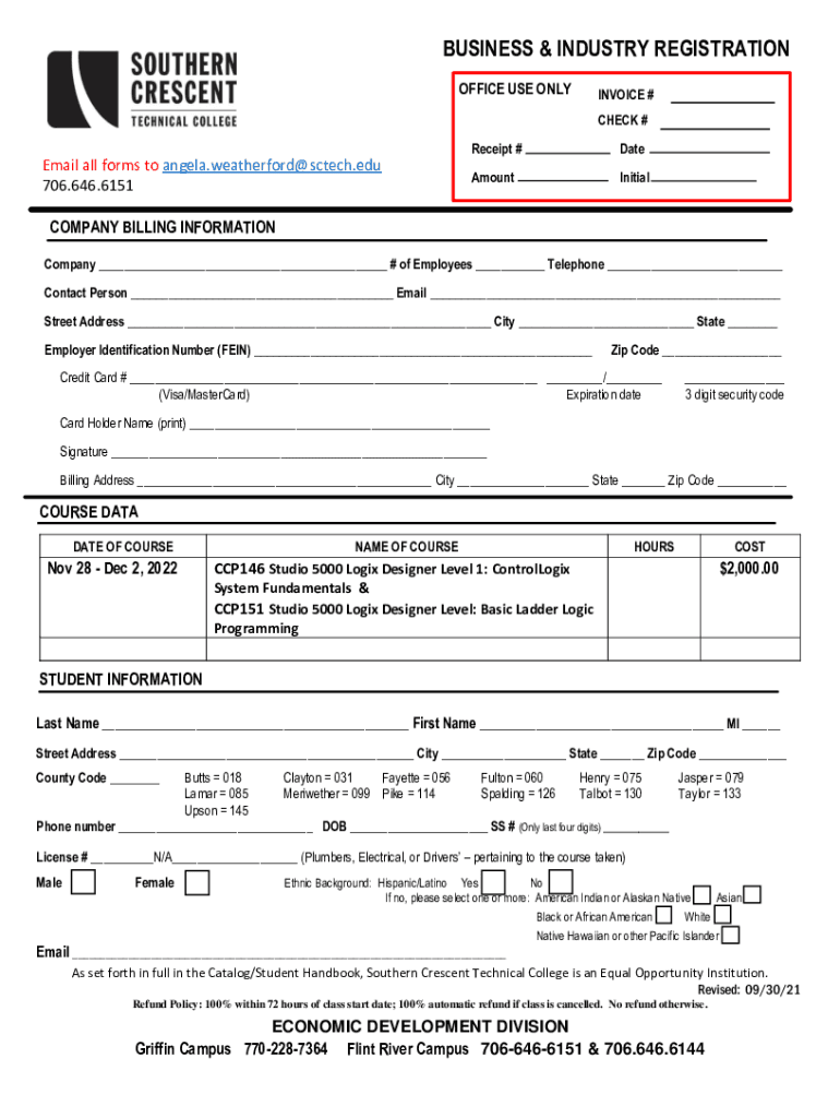 BUSINESS & INDUSTRY REGISTRATION OFFICE USE ONLYINVOICE # CHECK #Email all forms to angela.weatherford@sctech.edu 706.646.6151Receipt #DateAmountInitialCOMPANY BILLING INFORMATION Company ___ # of