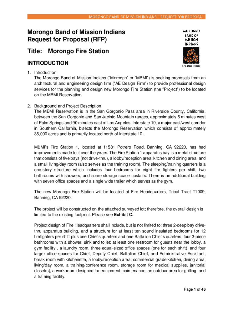 MORON GO BAND OF MISSION INDIANS REQUEST FOR PROPOSALMorongo Band of Mission Indians Request for Proposal (RFP) Title: Moron go Fire Station INTRODUCTION 1. Introduction The Moron go Band of Mission