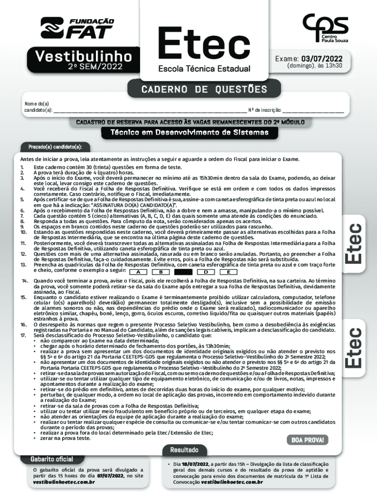 VestibulinhoExame: 03/07/20222 o SEM/2022(Domingo), s 13h30CADERNO DE QUESTS