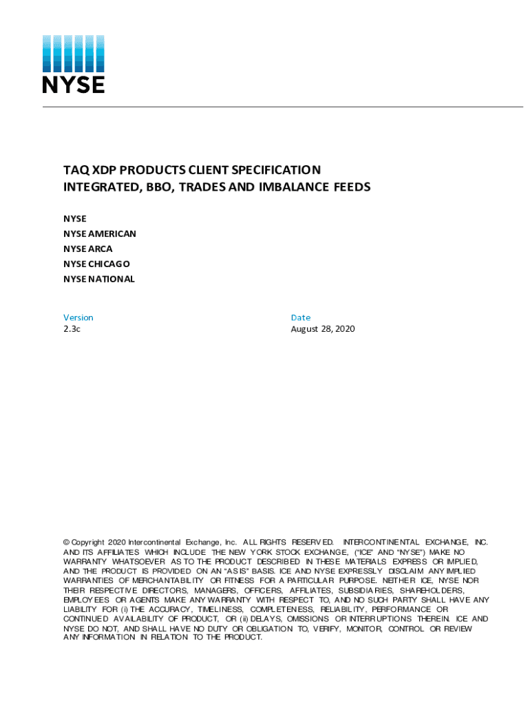 TAX GDP PRODUCTS CLIENT SPECIFICATION INTEGRATED, BBO, TRADES AND IMBALANCE FEEDS NYSE AMERICAN NYSE AREA NYSE CHICAGO NYSE NATIONALVersion 2.3cDate August 28, 2020, Copyright 2020 Intercontinental