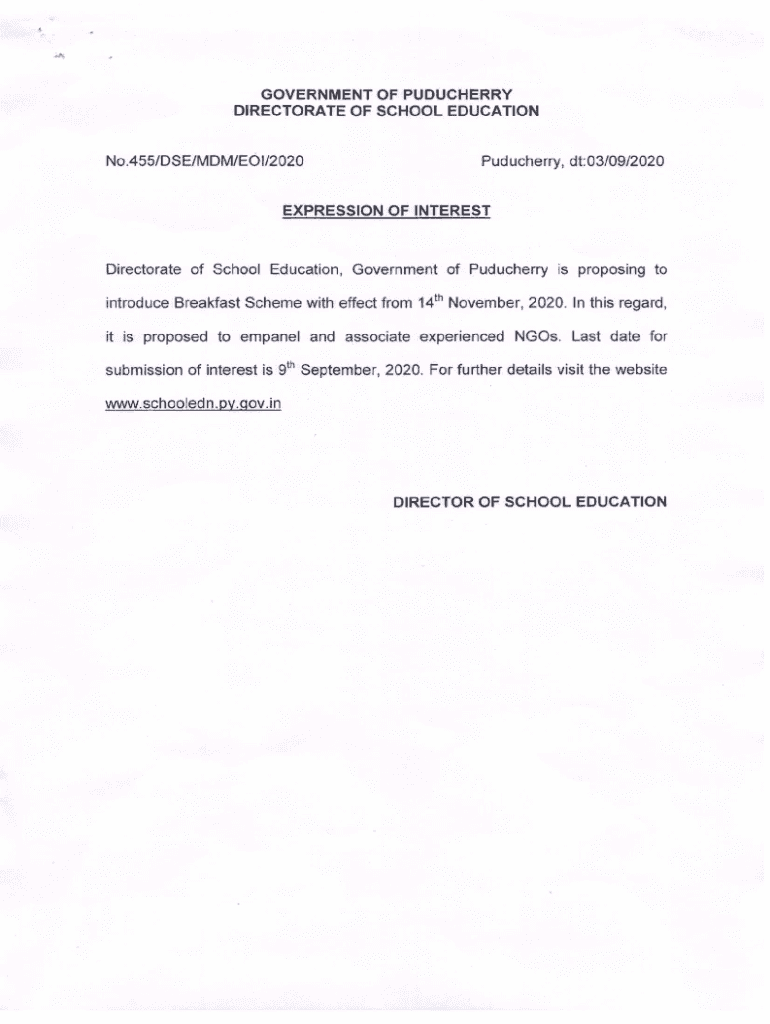 GOVERNMENT OF PONDICHERRY DIRECTORATE OF SCHOOL EDUCATIONNo.455/DSE/MDM/EOll2020Puducherry,dt:,03 I 09 l12O2OEXPRESSION OF INTERESTDirec\'tomato School Education, Government of Pondicherry is proposing