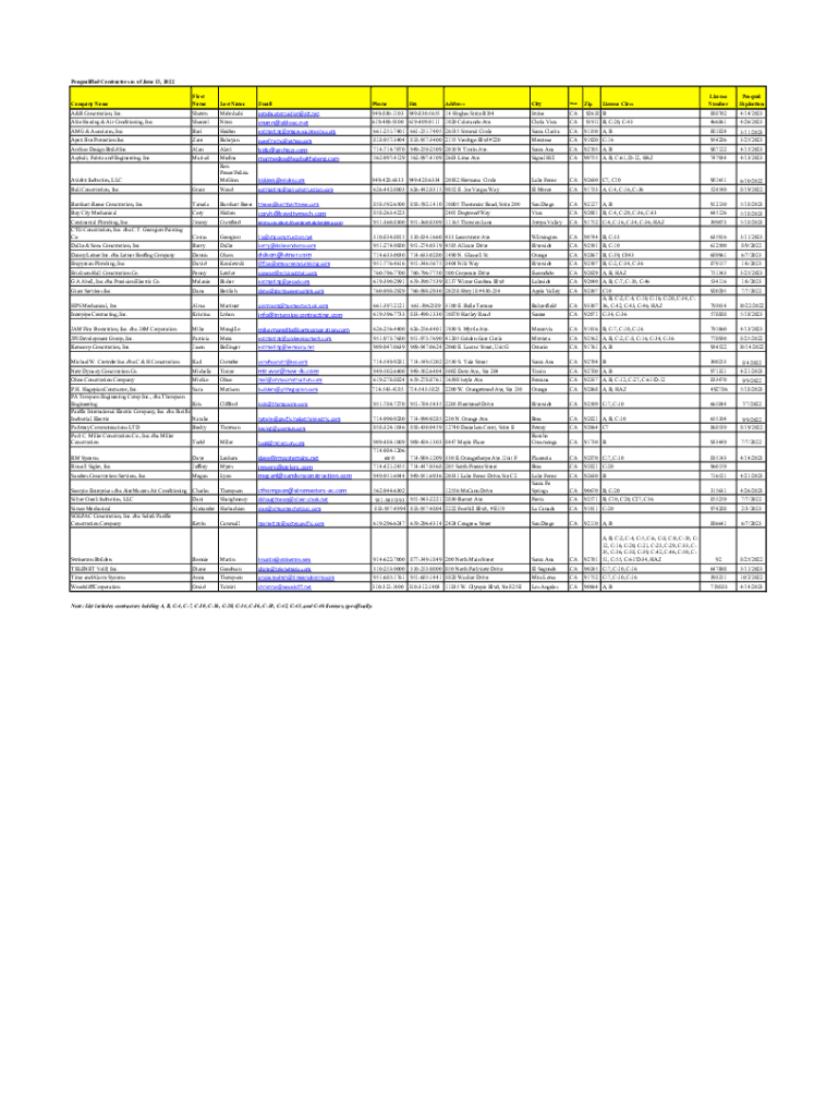 Prequalified Contractors as of June 13, 2022, License NumberPrequal Expiration92618 B8887024/14/2023CA91911 B, C20, C434668614/26/2023CA91350 A, B881824MontroseCA91020 C169542863/11/2023 3/25/20237147147070