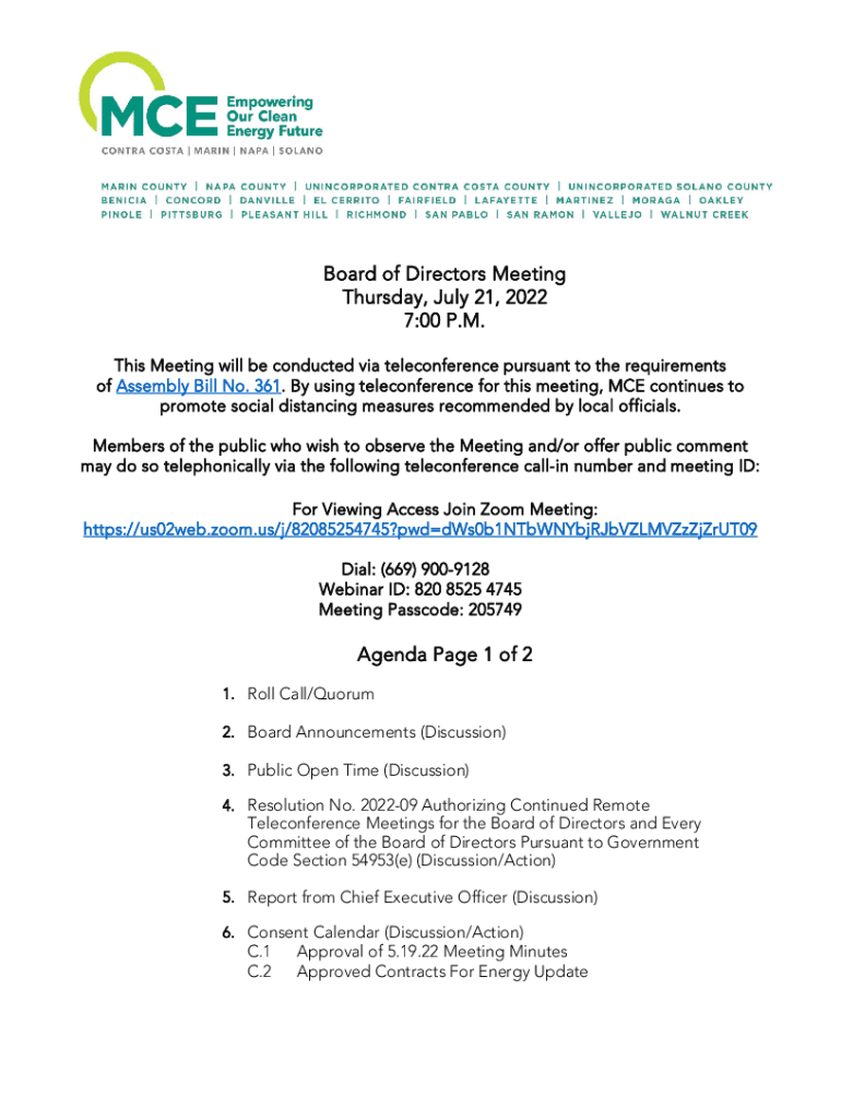 Board of Directors Meeting Thursday, July 21, 2022 7:00 P.M. This Meeting will be conducted via teleconference pursuant to the requirements of Assembly Bill No. 361. By using teleconference for this