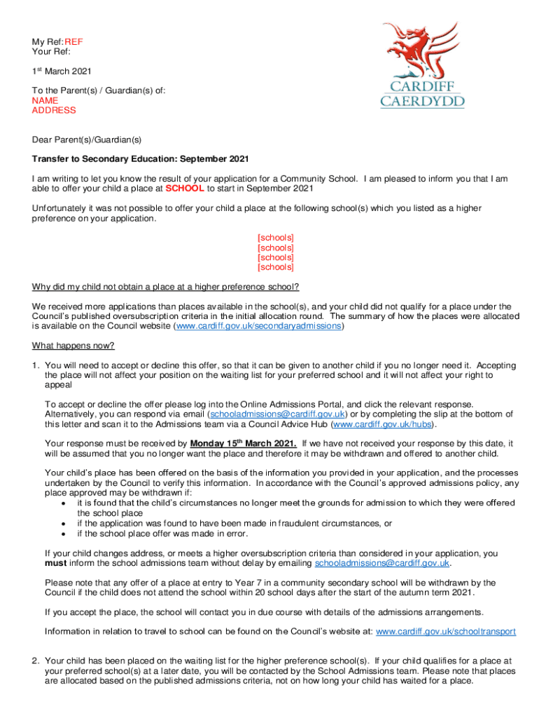 My Ref: REF Your Ref: 1st March 2021 To the Parent(s) / Guardian(s) of: NAME ADDRESS Dear Parent(s)/Guardian(s) Transfer to Secondary Education: September 2021 I am writing to let you know the result
