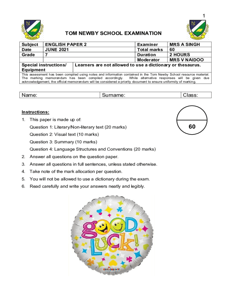 1 TOM NEWLY SCHOOL EXAMINATION Subject Date GradeENGLISH PAPER 2 JUNE 2021 7Special instructions/ EquipmentExaminer MRS A SINGH Total marks 60 Duration 2 HOURS Moderator MRS V NAIDOO Learners are