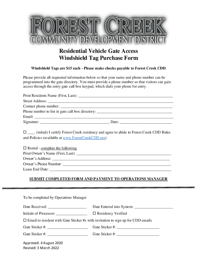 Residential Vehicle Gate Access Windshield Tag Purchase Form Windshield Tags are $15 each Please make checks payable to Forest Creek CDD Please provide all requested information below so that your