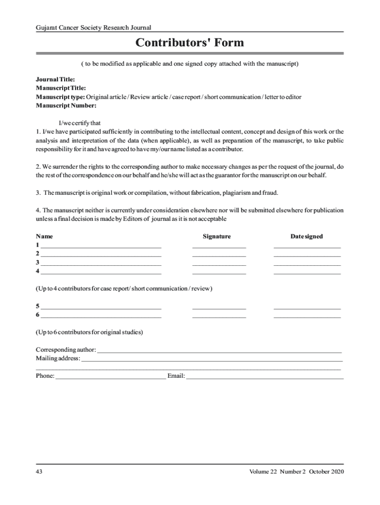 Gujarat Cancer Society Research JournalContributors\' Form (to be modified as applicable and one signed copy attached with the manuscript) Journal Title: Manuscript Title: Manuscript type: Original