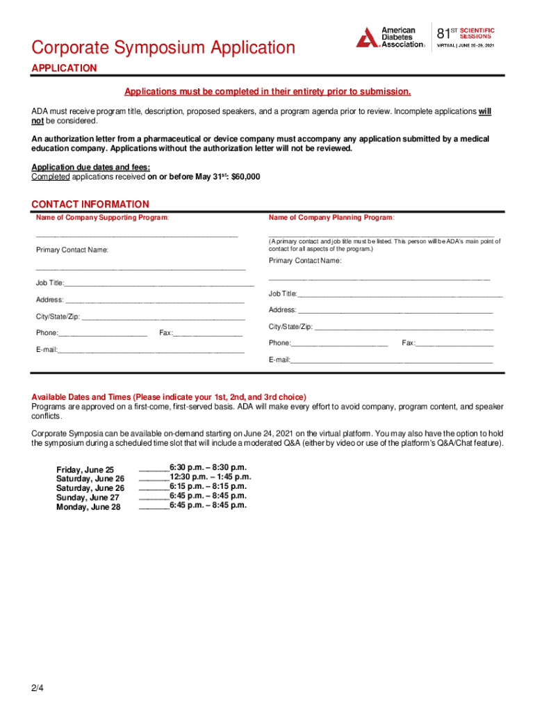 Corporate Symposium Application RULES & REGULATIONS 1. Corporate Symposia are programs that are planned and conducted by the corporate community in conjunction with the American Diabetes Associations