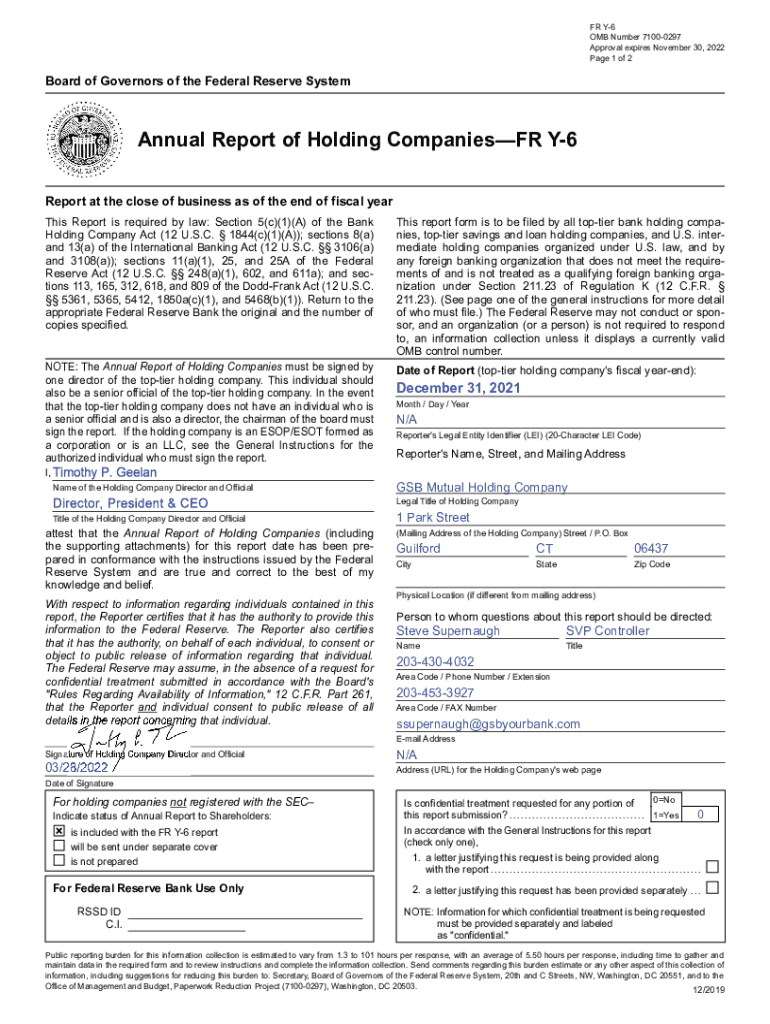 FR Y6 OMB Number 71000297 Approval expires November 30, 2022-Page 1 of 2Board of Governors of the Federal Reserve Systematical Report of Holding Companies FR Y6 Report at the close of business as