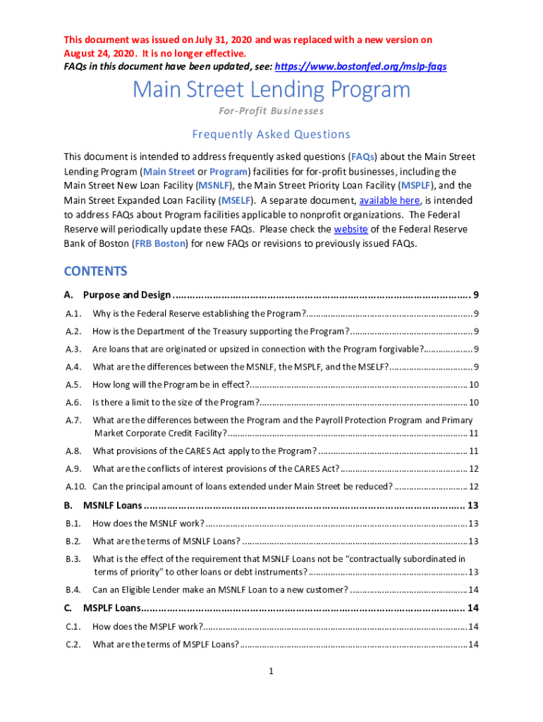 This document was issued on July 31, 2020, and was replaced with a new version on August 24, 2020. It is no longer effective. FAQs in this document have been updated, see: https://www.bostonfed.org/mslpfaqsMain